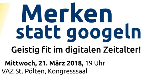 Die beiden Hirn- und Kognitionsforscher Katharina Turecek und Bernd Hufnagl geben am 21. März 2018 um 19 Uhr in St. Pölten (VAZ) Einblicke und Anleitungen, wie man das Hirn im Zeitalter der Digitalisierung geistig fit hält. Und sie stellen die provokante Frage: „Merkst Du´s Dir noch oder googelst Du nur mehr….?“