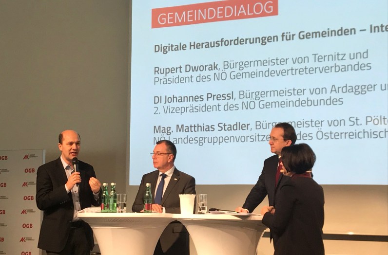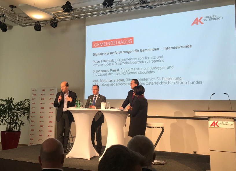 Die Arbeiterkammer Niederösterreich hat am 21.1.2019 erstmals den Projektfonds Arbeit 4.0 einer breiteren Öffentlichkeit vorgestellt. Vor allem die Gemeinden wurden über den Förderfonds informiert. Denn die Kommunen sind der Lebensmittelpunkt für die Arbeitnehmerinnen und Arbeitnehmer und genau hier sollen die Unterstützungen für Digitalisierungsprojekte reale Auswirkungen auf die Arbeit und die Lebensbedingungen in den Kommunen haben, hat es Markus Wieser in seinem Einleitungsstatement formuliert.
