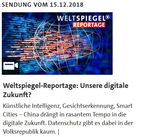 Das Erste Deutsche Fernsehen hat am 15.12.2018 eine WELTSPIEGEL-Reportage aus China mit dem Titel „Unsere digitale Zukunft“ ausgestrahlt. Im Prinzip arbeiten viele der vorgestellten Projekte, Ideen und Initiativen mit künstlicher Intelligenz, die sich wiederum aus abertausenden Datensätzen unterschiedlicher Herkunft speisen und sensationelle Lösungen für eine „bessere Welt“ in den Bereichen Gesundheit, Verkehrssteuerung oder Sicherheit, ….. hevorbringen können. Der Grat zum Überwachungsstaat ist allerdings bei missbräuchlicher Verwendung und bei lockeren Datenschutzregeln, wie auch gezeigt wird, ein schmaler ……