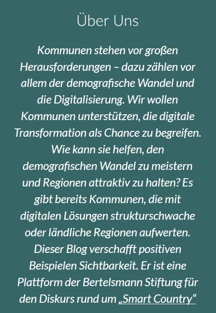 Nicht nur in Österreich, sondern auch in Deutschland geht es um das bestmögliche Nutzen der Digitalisierung als Chance für Gemeinden und Regionen. Die Bertelsmann Stiftung hat dazu eine Initiative „smart country“ gestartet. Den gleichnamigen Blog, der laufend interessante Beispiele und Initaitiven bringt, solltest Du abonnieren: https://blog-smartcountry.de/