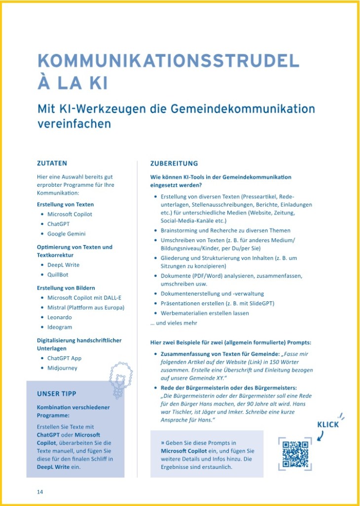 Das Land Niederösterreich hat ein Rezeptbuch für Gemeinden herausgegeben, wie man die digitale Veränderung zum größtmöglichen Nutzen für die Menschen und unter den Vorzeichen höchster Effizienz und Vereinfachung für die Mitarbeiter schafft. Hier gibts Rezept 5: “ Wie man KI Tools für Text- und Bilderstellung, fürs Reden schreiben und das Übertragen von Handschriften nutzen kann.“