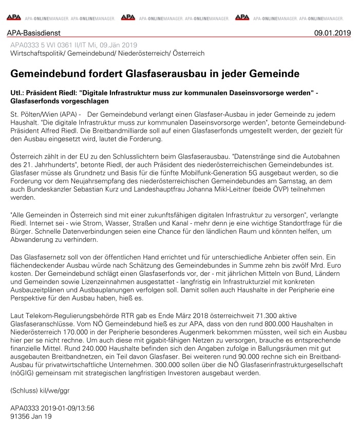 In einer Aussendung hat der NÖ.Gemeindebund am 9.1.2019 ein Glasfasernetz für ganz Österreich und für jede Gemeinde – langfristig auch bis zu jedem Haushalt – gefordert. „Für uns ist klar: Nur mit #Glasfaser haben alle Regionen und #Gemeinden eine Chance! Wir sagen: Die digitale #Infrastruktur ist genauso wichtig, wie das Wasser-, Kanal-, Strom- und Straßennetz – mit einem Glasfaserfonds können wir den Ausbau konsequent und zielgerichtet umsetzen!“ schreibt auch der österreichische Gemeindebund dazu auf seiner facebook-Seite. Hier die gesamte Aussendung und die Berichterstattung dazu in den österreichischen Medien: